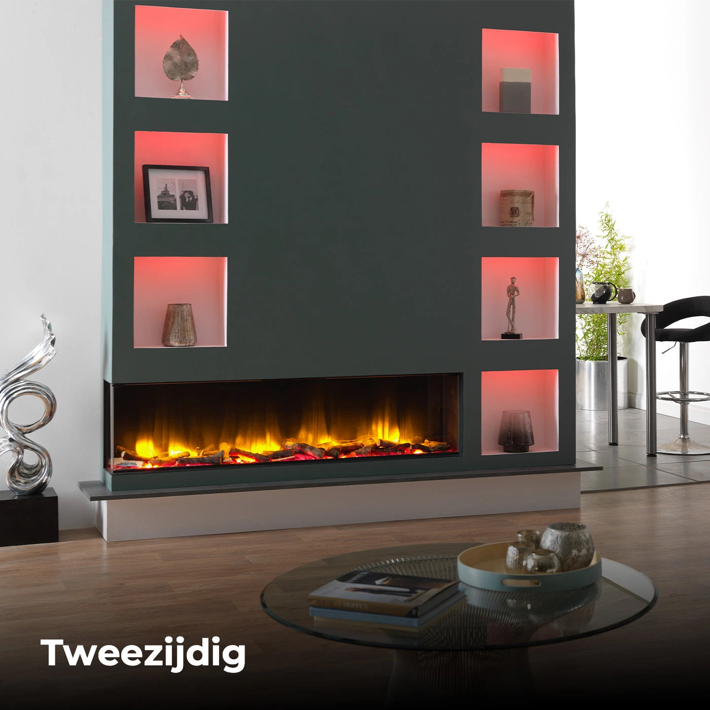 Son design offre des possibilités infinies, permettant aux cheminées de prendre une place centrale dans votre intérieur, qu'elles soient intégrées à des bibliothèques, des meubles TV et audio ou des éléments muraux élégants. Les bandes lumineuses LED d'ambiance, disponibles en option et mesurant jusqu'à 6 mètres de long, sont pilotables via la télécommande de la cheminée et s'intègrent à votre intérieur selon vos envies.