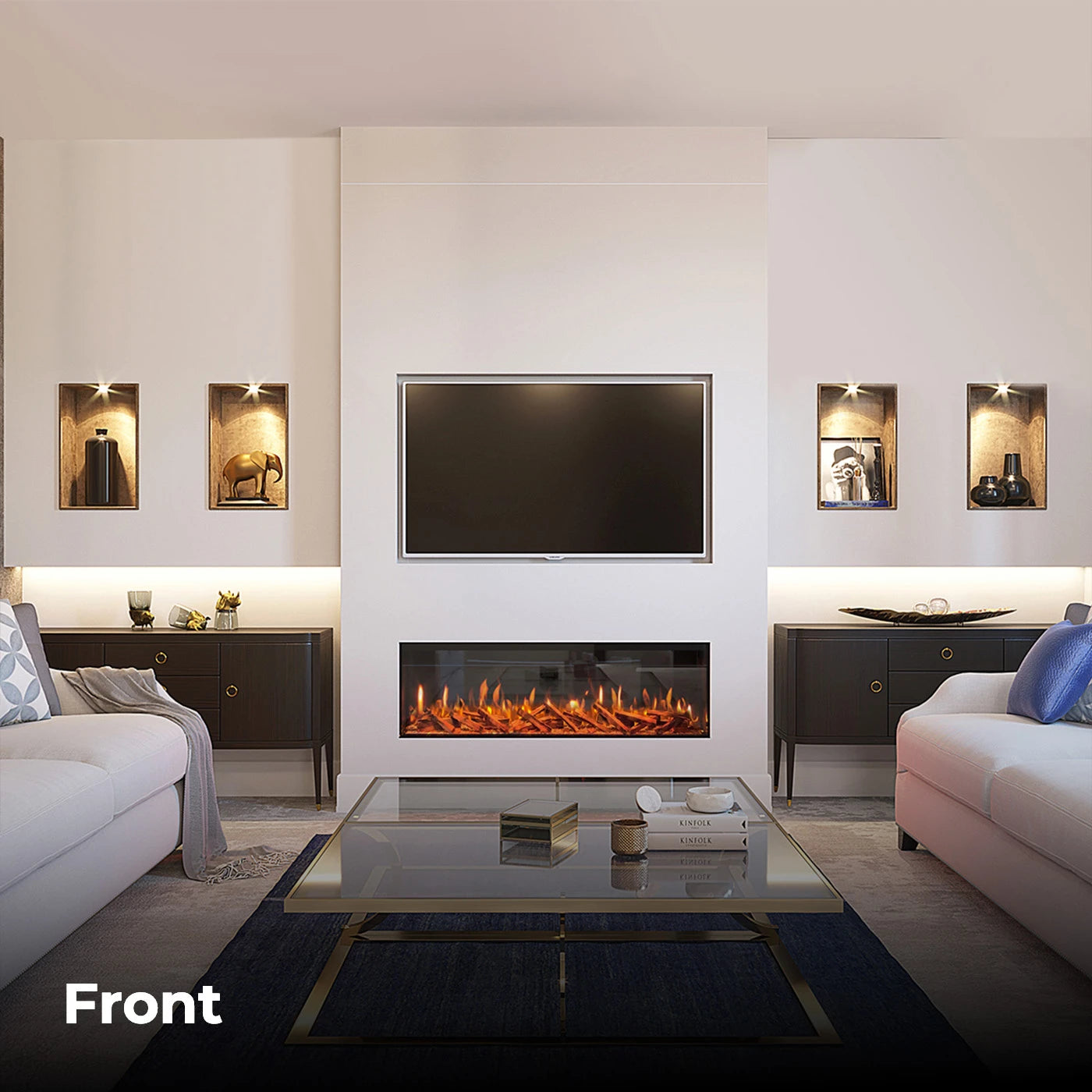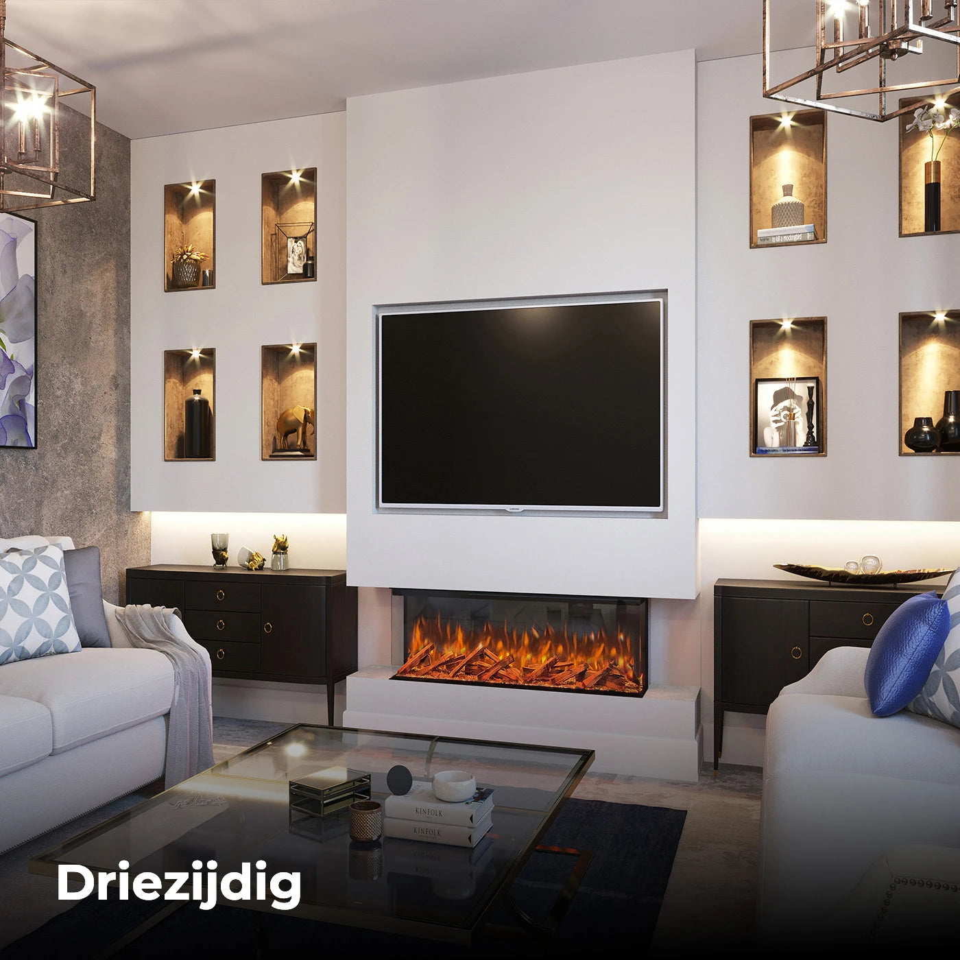 - Veelzijdig Ontwerp: Pas je haard aan aan je voorkeuren met drie verschillende installatieopties: frontaal, tweezijdig of driezijdig. Ongeacht je ruimte, integreert onze haard naadloos in je interieur en voegt een vleugje elegantie en warmte toe.