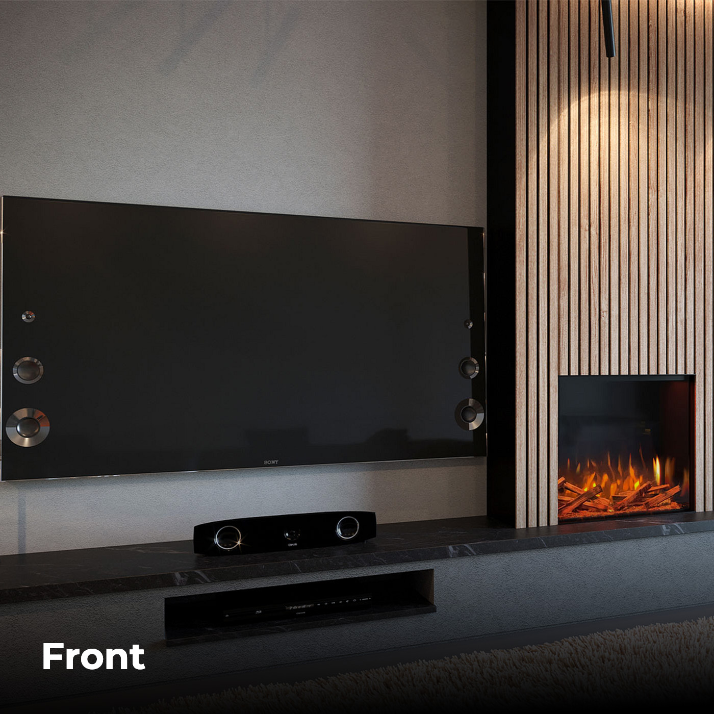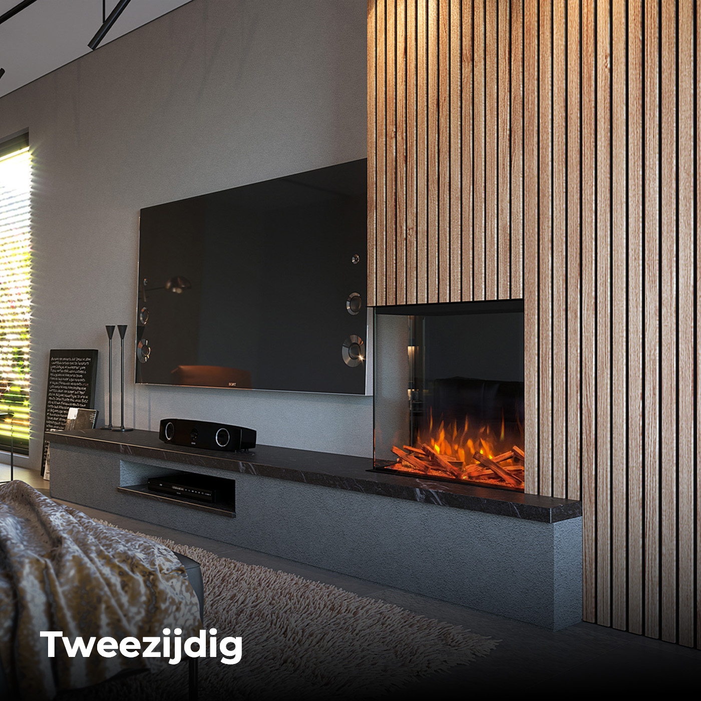 • Veelzijdig Ontwerp: Pas je haard aan aan je voorkeuren met drie verschillende installatieopties: frontaal, tweezijdig of driezijdig. Ongeacht je ruimte, integreert onze haard naadloos in je interieur en voegt een vleugje elegantie en warmte toe.