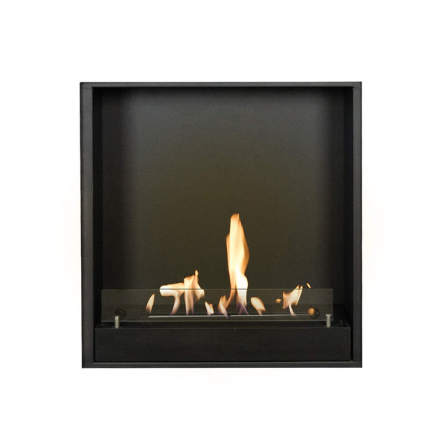Grand insert de cheminée bioéthanol avec parois latérales et arrière en métal. Le métal ne se contente pas de protéger. En brûlant, il se réchauffe agréablement et diffuse une chaleur agréable.
